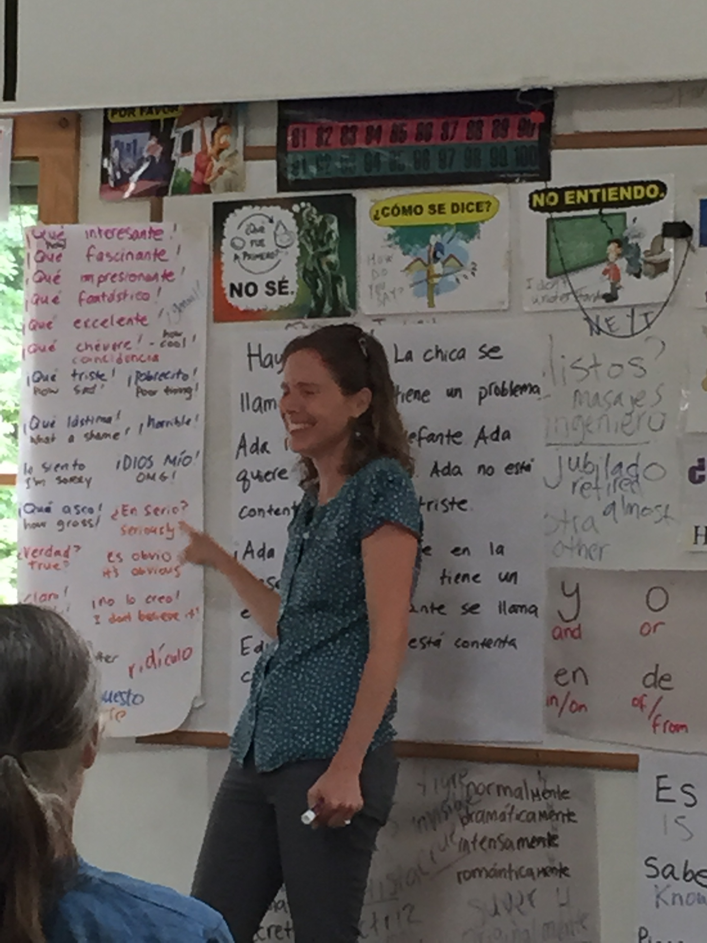 I am sitting in the class watching the most marvelous beginner Spanish instruction–not in a University, not abroad in an immersion setting, but on a mountaintop in Brattleboro, Vermont. After one day of instruction, the students read and comprehend a minimum of 130 written words, and comprehend twice that orally. They are laughing and telling stories about Hilary Clinton who can’t cook, about Eduardo the elephant, “Zanahoria (carrot),” an invisible tiger and their male classmate who claims to be a princess. The mantra in this class is “Todo es posible en la clase de español.” And it’s true! Everything seems possible here–the teacher illustrates absolute gifts in presence and improvisation. At the same time she controls a range of vocabulary that is limited but expansive enough to express a great range of actions and states of being. I am in AWE. If you don’t speak Spanish and want to get started in a deep and meaningful way–get thee to Vermont! Here is a link to her class website. I can’t wait to write more about how this class works, why, and why more language teachers and teacher educators should be trained in this method.